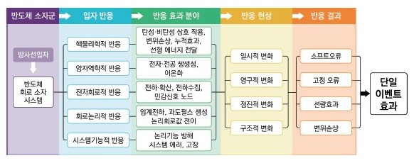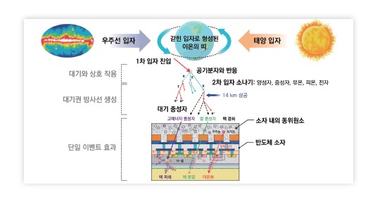 첫째, 우주선에서 날아오는 고에너지 입자입니다. 지구 대기권 밖에는 양성자나 중이온 같은 입자들이 끊임없이 쏟아지고 있습니다. 대부분은 대기에서 걸러지지만, 일부는 지표면까지 도달해 반도체 회로에 영향을 줄 수 있습니다.